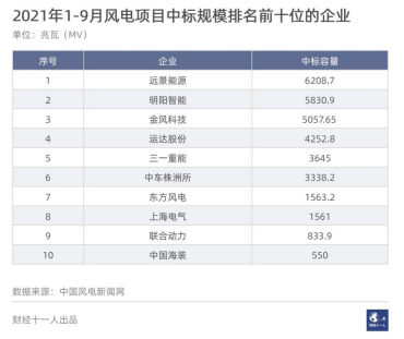 圖2:2021年1-9月風電項目中標統(tǒng)計情況