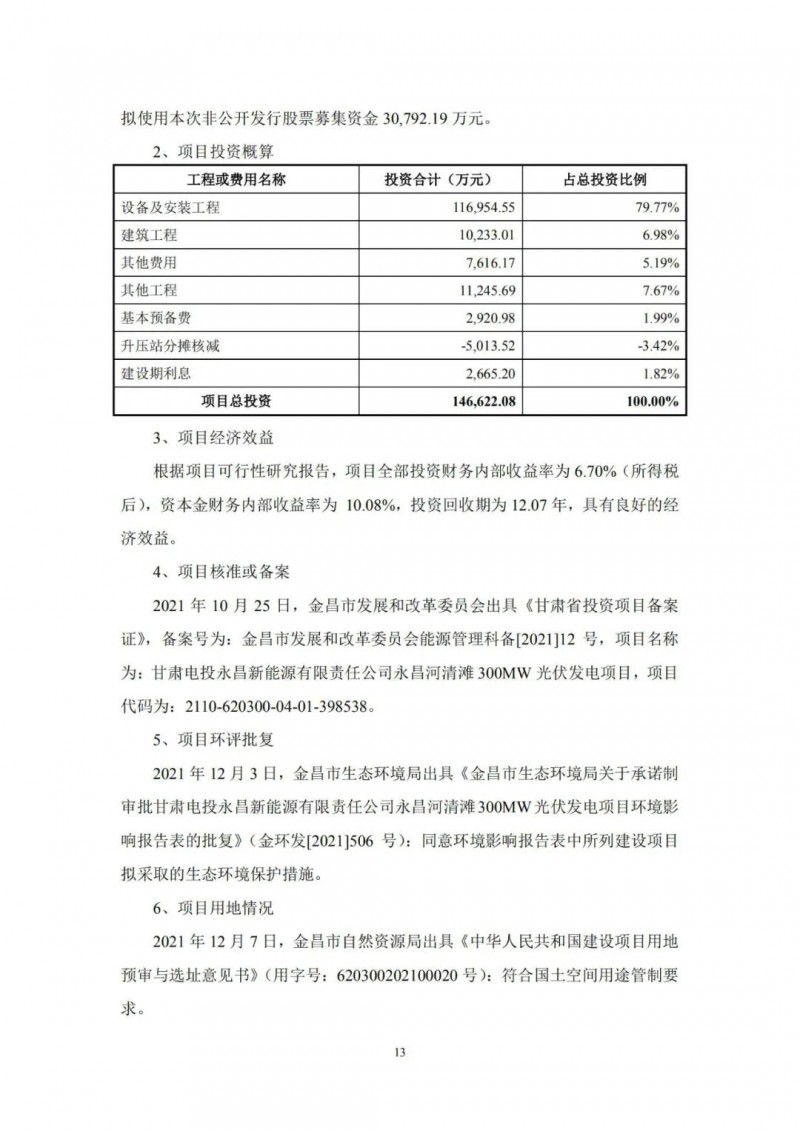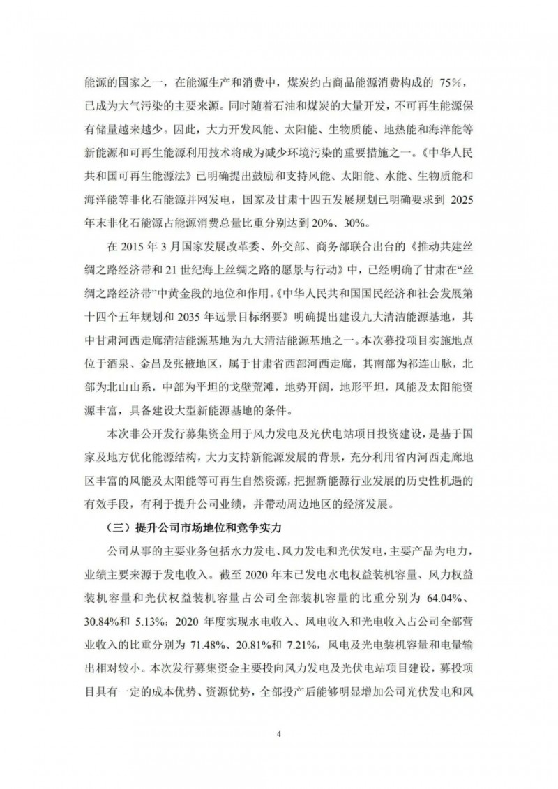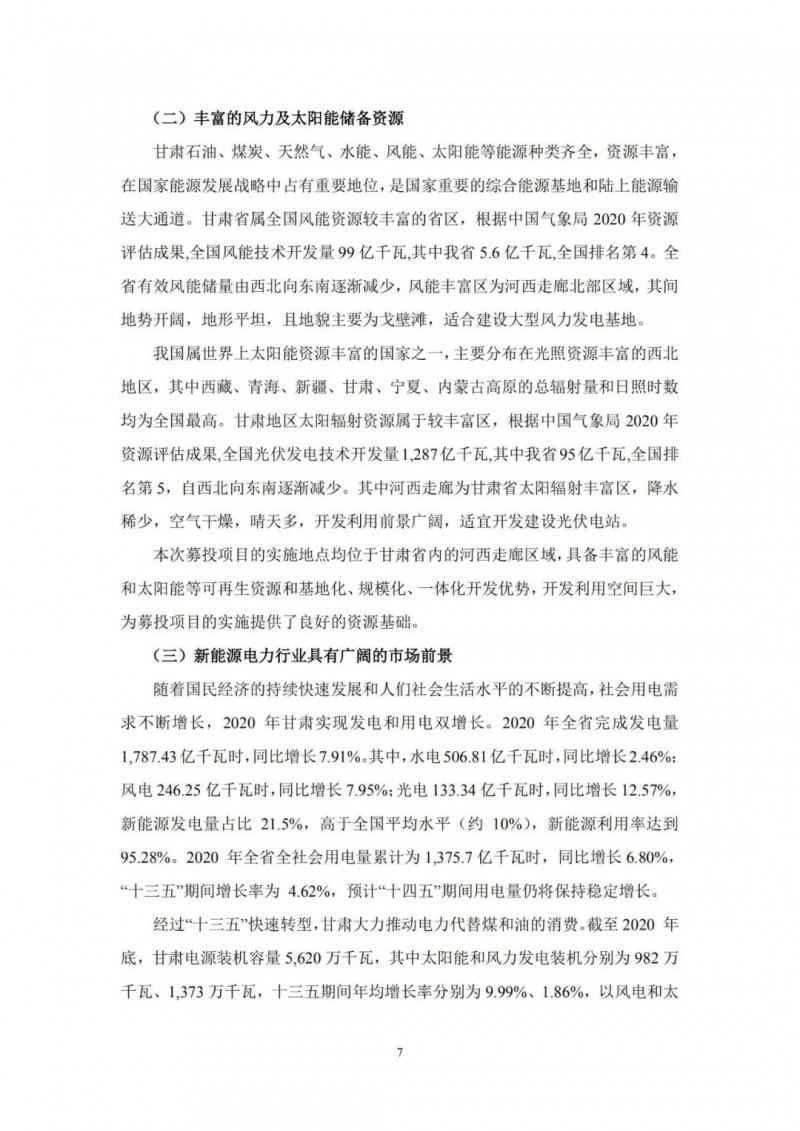 2月21日,甘肅電投發(fā)布公告,擬定增募資不超過12億元,用于玉門市麻黃灘第一風(fēng)電場(chǎng)C區(qū)200兆瓦項(xiàng)目、瓜州干河口200MW光伏項(xiàng)目、永昌河清灘300MW光伏發(fā)電項(xiàng)目、高臺(tái)縣鹽池灘100MW風(fēng)電場(chǎng)項(xiàng)目及補(bǔ)充流動(dòng)資金。天眼查app顯示,公司是于1997年7月8日經(jīng)甘肅省人民政府甘政函[1997]36號(hào)文件批準(zhǔn),由西北油漆廠獨(dú)家發(fā)起,部分改制,采用募集設(shè)立方式設(shè)立的股份有限公司。公司1997年8月29日向社會(huì)公眾公開發(fā)行4500萬股人民幣普通股,并于1997年9月23在甘肅省工商行政管理局登記注冊(cè)。1997年10月14日經(jīng)中國(guó)證券監(jiān)督管理委員會(huì)批準(zhǔn),公司股票在深圳證券交易所上市交易。自2012年12月21日起,公司名稱由"西北永新化工股份有限公司"變更為"甘肅電投能源發(fā)展股份有限公司"。