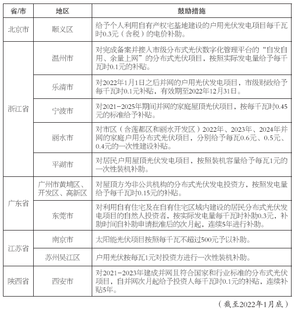 2022年新建項(xiàng)目國(guó)家補(bǔ)貼政策還未明確,戶用光伏平價(jià)上網(wǎng)已被業(yè)內(nèi)認(rèn)為是大勢(shì)所趨。據(jù)不完全統(tǒng)計(jì),截至2022年1月底,已有北京、浙江、江蘇等省(市)的二十多個(gè)地區(qū)提出了分布式光伏新增項(xiàng)目電價(jià)補(bǔ)貼、補(bǔ)助或獎(jiǎng)勵(lì)政策,部分地區(qū)還為戶用光伏項(xiàng)目設(shè)置了專項(xiàng)補(bǔ)貼,以期吸引更多社會(huì)資本進(jìn)入當(dāng)?shù)貞粲霉夥袌?chǎng)。