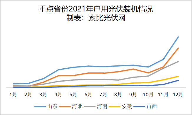 從2021年各省戶用光伏裝機規(guī)???,山東、河北、河南依然是最核心的三個主力市場,安徽、山西、江西、福建、江蘇等5個省也實現(xiàn)了裝機超400MW、占比超2%的目標。