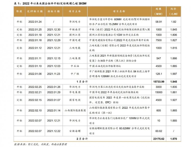 地面電站裝機(jī)需求釋放,央國(guó)企組件開(kāi)標(biāo)熱潮開(kāi)啟。2021年12月上旬硅片庫(kù)存去化、產(chǎn)業(yè)鏈價(jià)格回落,地面電站的組件招標(biāo)逐步啟動(dòng);疊加部分項(xiàng)目延期、補(bǔ)裝組件等因素,2022開(kāi)年來(lái)終端需求呈現(xiàn)爆發(fā)式增長(zhǎng)。根據(jù)我們統(tǒng)計(jì),2022年1-2月,以央國(guó)企為主的組件開(kāi)標(biāo)/定標(biāo)規(guī)模已達(dá)38.9GW。考慮到統(tǒng)計(jì)信息的不完全性,實(shí)際開(kāi)標(biāo)/定標(biāo)規(guī)模有望達(dá)到40GW,終端需求表現(xiàn)強(qiáng)勢(shì)。