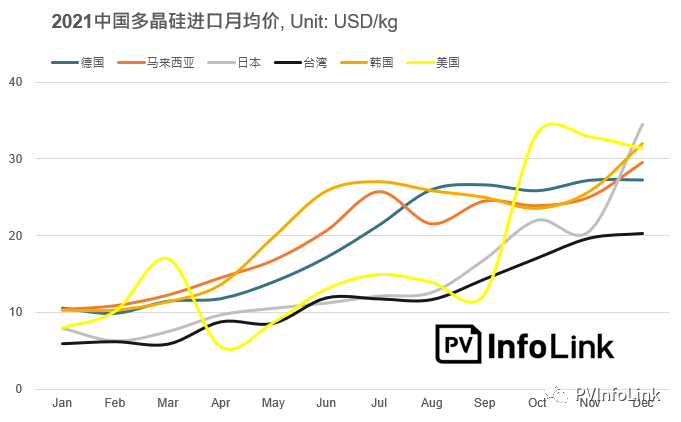 多晶硅市場(chǎng)在2021年經(jīng)歷了較大的動(dòng)蕩,因整體光伏供應(yīng)鏈的產(chǎn)能錯(cuò)配,使得硅料價(jià)格整年大都維持上漲態(tài)勢(shì)。除了中國國內(nèi)市場(chǎng)多晶硅交易價(jià)格上漲外,連帶使得價(jià)格相對(duì)平穩(wěn)的海外料價(jià)格也出現(xiàn)較大的波動(dòng),全年價(jià)格趨勢(shì)同樣呈現(xiàn)上升趨勢(shì)。PV Infolink透過統(tǒng)計(jì)2020 – 2021中國海關(guān)的多晶硅進(jìn)口信息,分析變化原因與未來影響。