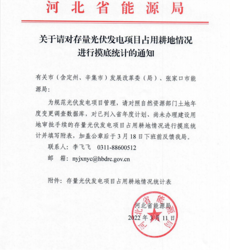 3月11日,河北省能源局啟動存量光伏電站占用耕地摸底統(tǒng)計工作,文件要求對照自然資源部門土地年度變更調(diào)查數(shù)據(jù)庫,對已列入省年度計劃、尚未辦理建設(shè)用地審批手續(xù)的存量光伏發(fā)電項目占用耕地情況進行摸底統(tǒng)計。附表信息統(tǒng)計中包括項目名稱、開發(fā)企業(yè)、備案證號、建設(shè)規(guī)模及地點、納入計劃批次以及場址總面積、已占用面積以及建設(shè)進度等多項詳細信息。