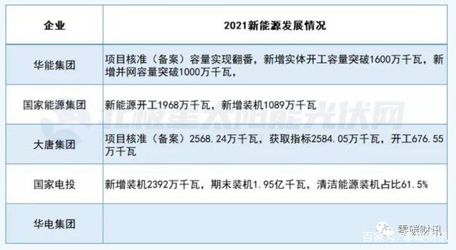 公開數(shù)據(jù)顯示,2021年,華能集團(tuán)實現(xiàn)新能源新增并網(wǎng)超1000萬千瓦,實體開工超1600萬千瓦、國家能源集團(tuán)新能源開工1968萬千瓦,新增裝機(jī)1089萬千瓦、大唐集團(tuán)新能源項目核準(zhǔn)(備案)2568.24萬千瓦,獲取指標(biāo)2584.05萬千瓦。