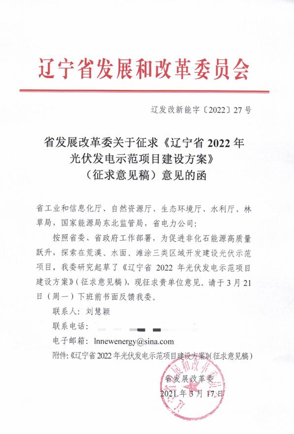 3月17日,遼寧省發(fā)展改革委關(guān)于征求《遼寧省2022年光伏發(fā)電示范項(xiàng)目建設(shè)方案》(征求意見(jiàn)稿)意見(jiàn)的函。