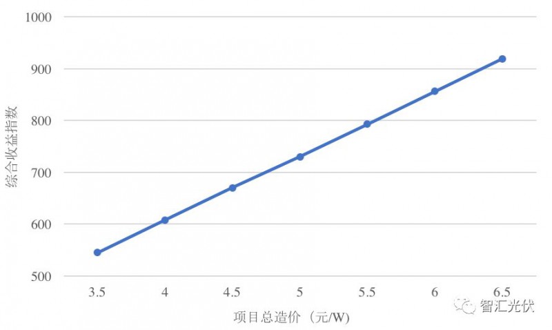 當(dāng)初始投資為4元/W時,綜合收益指數(shù)(發(fā)電小時數(shù)×上網(wǎng)電價)達(dá)到610時,項目內(nèi)部收益率即可達(dá)到基準(zhǔn)收益率8%。