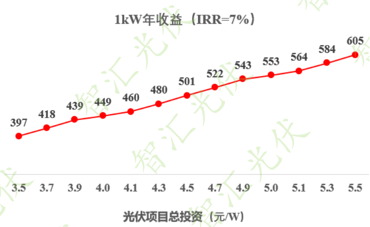 假設(shè)山東某地光伏項目,首年滿發(fā)小時數(shù)為1350小時,山東的脫硫煤電價電價為0.3949元/kWh;該項目1kW年收益 = 1350*0.3949=533根據(jù)上表,533應(yīng)該介于總投資4.7元/W與4.9元/W之間。因此,項目總投資要控制在4.8元/W以內(nèi)時,該項目全投資內(nèi)部收益率可以達(dá)到7%以上。假設(shè)內(nèi)蒙古蒙西某地光伏項目,首年滿發(fā)小時數(shù)為1700小時,蒙西的脫硫煤電價電價為0.2829元/kWh;該項目1kW年收益 = 1700*0.2829=481根據(jù)上表,481對應(yīng)的總投資為4.3元/W。因此,項目總投資要控制在4.3元/W以內(nèi)時,該項目全投資內(nèi)部收益率可以達(dá)到7%以上。如果所在企業(yè)收益率標(biāo)準(zhǔn)不是7%,而是6.5%,用同樣的方法,也可以計算出“1kW年收益”的對應(yīng)數(shù)值。