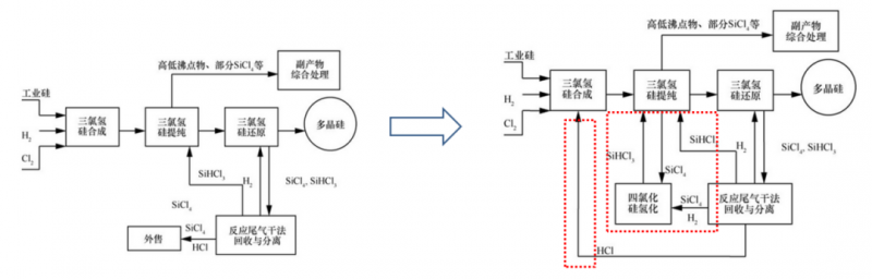由于改良西門子法生成的副產物和尾氣較多,影響到生產成本。如何有效循環(huán)和處理產物關系到未來的降本方向。比如西門子法生產過程中會產生大量的副產物SiCl4,將SiCl4轉化成作為多晶硅生產原料的SiHCl3,從而實現閉環(huán)生產,以提高硅粉利用率,降低生產成本。