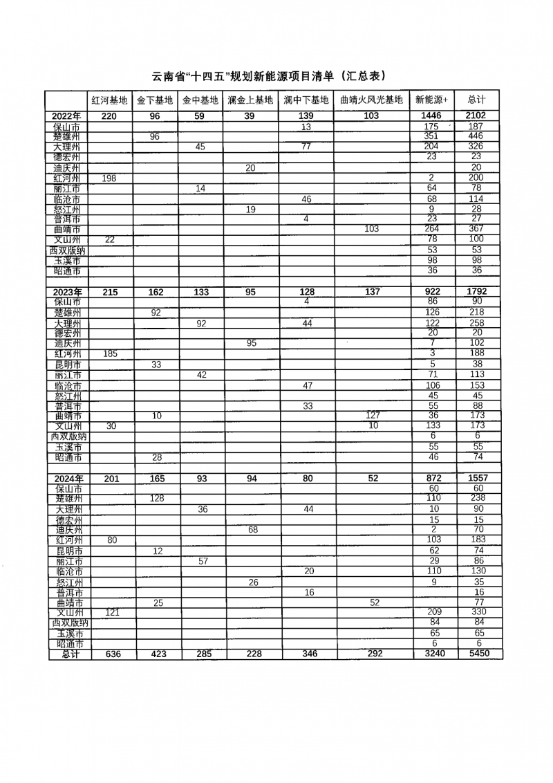 5450萬千瓦項目主要包括紅河基地636萬千瓦、金下基地423萬千瓦、金中基地285萬千瓦、瀾金上基地228萬千瓦、瀾中下基地346萬千瓦、曲靖火風光基地292萬千瓦、新能源+3240萬千瓦。
