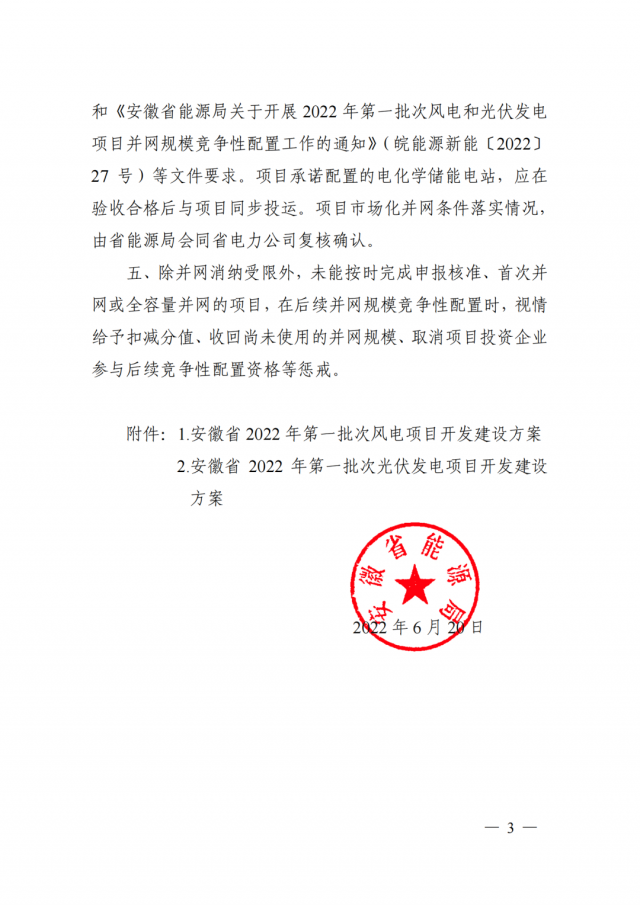 6月20日,安徽省能源局正式下發(fā)了《關(guān)于2022年第一批次風(fēng)電和光伏發(fā)電項(xiàng)目開發(fā)建設(shè)方案》的通知。根據(jù)該通知,安徽省2022年全省第一批次風(fēng)電和光伏發(fā)電項(xiàng)目并網(wǎng)規(guī)模競爭性配置,確定建設(shè)21個(gè)光伏發(fā)電項(xiàng)目和13個(gè)風(fēng)電項(xiàng)目,總裝機(jī)規(guī)模300萬千瓦,其中光伏200萬千瓦、風(fēng)電100萬千瓦。
