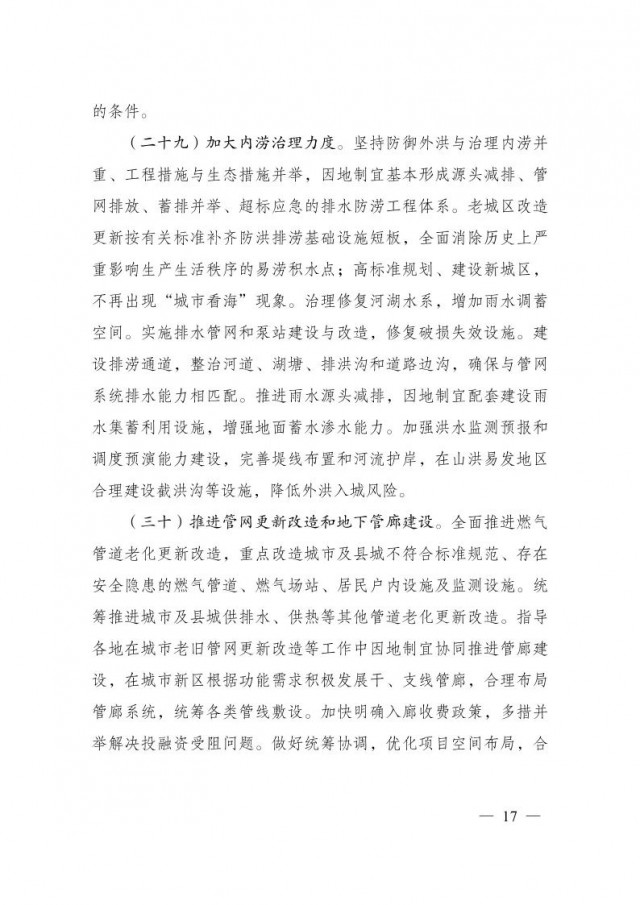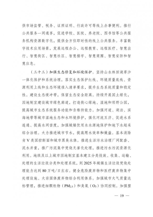 《方案》提出,到2025年,城市可持續(xù)發(fā)展能力明顯增強,城鎮(zhèn)開發(fā)邊界全面劃定,新增建設(shè)用地規(guī)??刂圃?950萬畝以內(nèi),城市內(nèi)澇治理取得明顯成效,城市燃氣等管道老化更新改造深入推進,能源資源利用效率大幅提升,城市黑臭水體基本消除,地級及以上城市空氣質(zhì)量優(yōu)良天數(shù)比率提高到87.5%,城市建成區(qū)綠化覆蓋率超過43%。系統(tǒng)完備、科學規(guī)范、運行有效的城市治理體系基本建立,治理能力明顯增強。