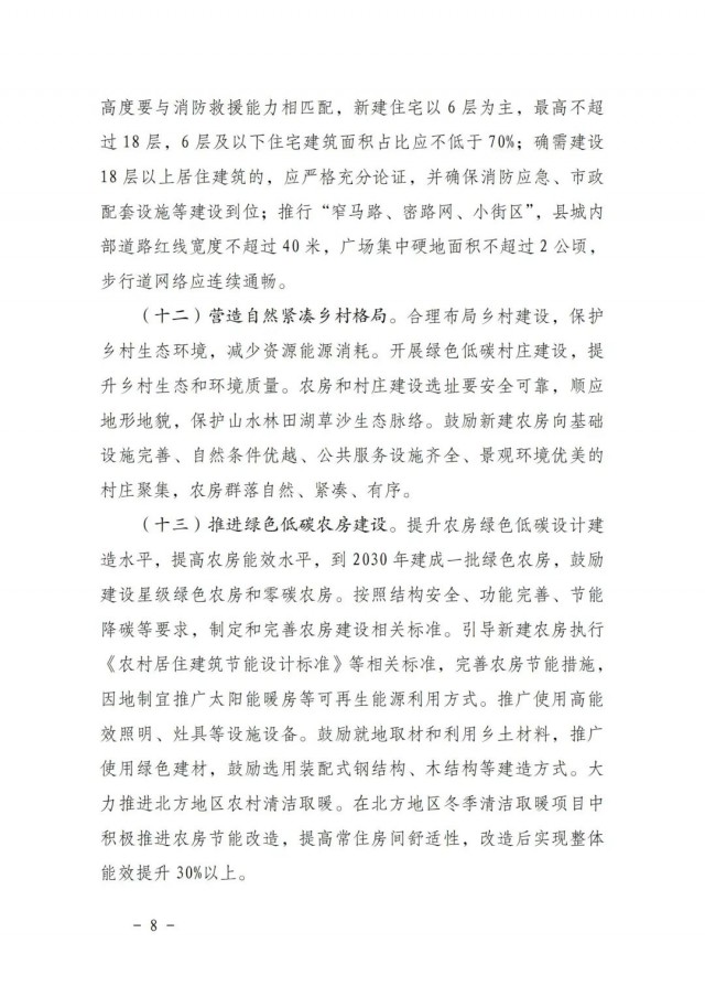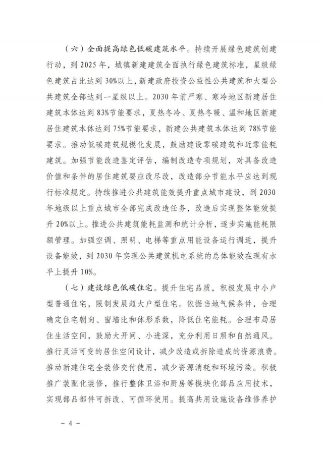 《方案》指出,全面提高綠色低碳建筑水平。持續(xù)開展綠色建筑創(chuàng)建行動(dòng),到2025年,城鎮(zhèn)新建建筑全面執(zhí)行綠色建筑標(biāo)準(zhǔn),星級(jí)綠色建筑占比達(dá)到30%以上,新建政府投資公益性公共建筑和大型公共建筑全部達(dá)到一星級(jí)以上。2030年前嚴(yán)寒、寒冷地區(qū)新建居住建筑本體達(dá)到83%節(jié)能要求,夏熱冬冷、夏熱冬暖、溫和地區(qū)新建居住建筑本體達(dá)到75%節(jié)能要求,新建公共建筑本體達(dá)到78%節(jié)能要求。推動(dòng)低碳建筑規(guī)?;l(fā)展,鼓勵(lì)建設(shè)零碳建筑和近零能耗建筑。