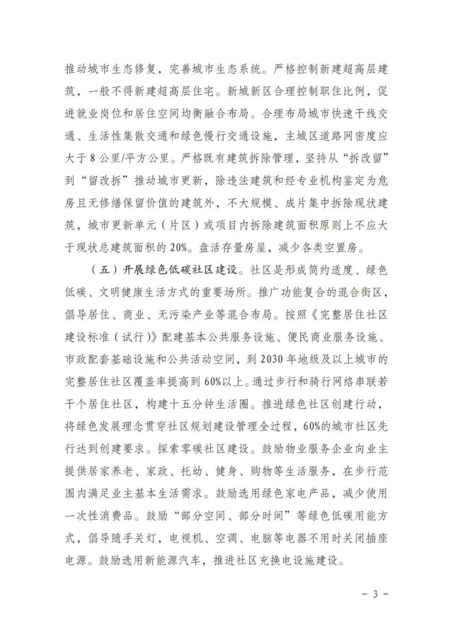 《方案》提出開展綠色低碳社區(qū)建設(shè)。推廣功能復(fù)合的混合街區(qū),倡導(dǎo)居住、商業(yè)、無污染產(chǎn)業(yè)等混合布局。按照《完整居住社區(qū)建設(shè)標(biāo)準(zhǔn)(試行)》配建基本公共服務(wù)設(shè)施、便民商業(yè)服務(wù)設(shè)施、市政配套基礎(chǔ)設(shè)施和公共活動(dòng)空間,到2030年地級(jí)及以上城市的完整居住社區(qū)覆蓋率提高到60%以上。通過步行和騎行網(wǎng)絡(luò)串聯(lián)若干個(gè)居住社區(qū),構(gòu)建十五分鐘生活圈。推進(jìn)綠色社區(qū)創(chuàng)建行動(dòng),將綠色發(fā)展理念貫穿社區(qū)規(guī)劃建設(shè)管理全過程,60%的城市社區(qū)先行達(dá)到創(chuàng)建要求。探索零碳社區(qū)建設(shè)。鼓勵(lì)物業(yè)服務(wù)企業(yè)向業(yè)主提供居家養(yǎng)老、家政、托幼、健身、購物等生活服務(wù),在步行范圍內(nèi)滿足業(yè)主基本生活需求。鼓勵(lì)選用綠色家電產(chǎn)品,減少使用一次性消費(fèi)品。鼓勵(lì)“部分空間、部分時(shí)間”等綠色低碳用能方式,倡導(dǎo)隨手關(guān)燈,電視機(jī)、空調(diào)、電腦等電器不用時(shí)關(guān)閉插座電源。鼓勵(lì)選用新能源汽車,推進(jìn)社區(qū)充換電設(shè)施建設(shè)。