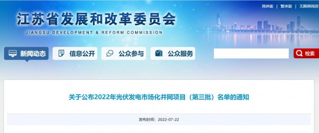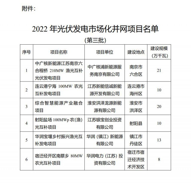 為積極貫徹落實國家“碳達峰碳中和”長期目標,推動我省光伏發(fā)電平穩(wěn)有序發(fā)展,按照《省發(fā)展改革委關于開展2022年光伏發(fā)電市場化并網(wǎng)項目開發(fā)建設的通知》(蘇發(fā)改能源發(fā)〔2022〕350號)有關要求,現(xiàn)將我省2022年光伏發(fā)電市場化并網(wǎng)項目(第三批)名單予以公布。