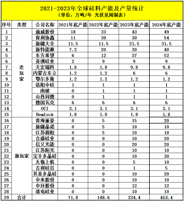 2021年以來,硅料老玩家大舉擴(kuò)產(chǎn),新玩家實(shí)力雄厚如過江之鯽,這一輪硅料牛市涌現(xiàn)了將近30家硅料企業(yè)。光伏見聞根據(jù)公開消息不完全統(tǒng)計(jì),2022年底,硅料企業(yè)新老玩家產(chǎn)能將達(dá)到148.6萬噸,2023年底,硅料企業(yè)產(chǎn)能則將達(dá)到334.4萬噸,如果產(chǎn)能完全釋放,保守估計(jì)這些硅料可生產(chǎn)的組件則分別為505GW、1136GW。