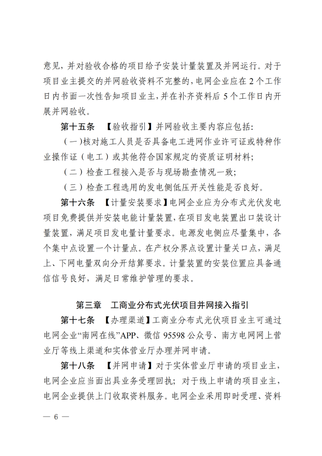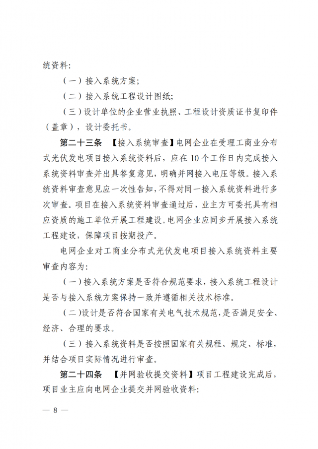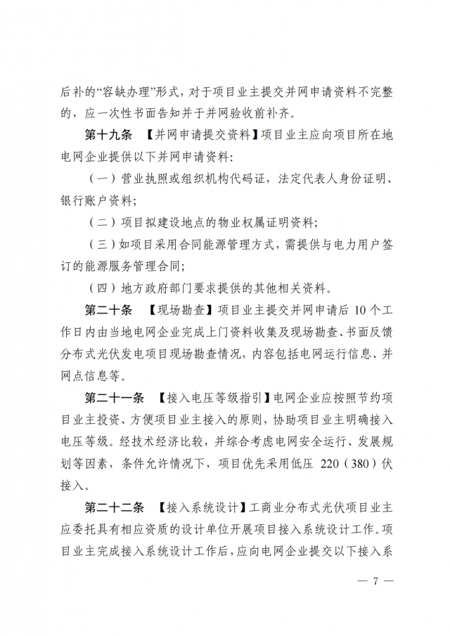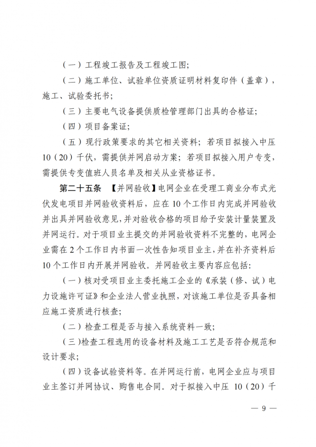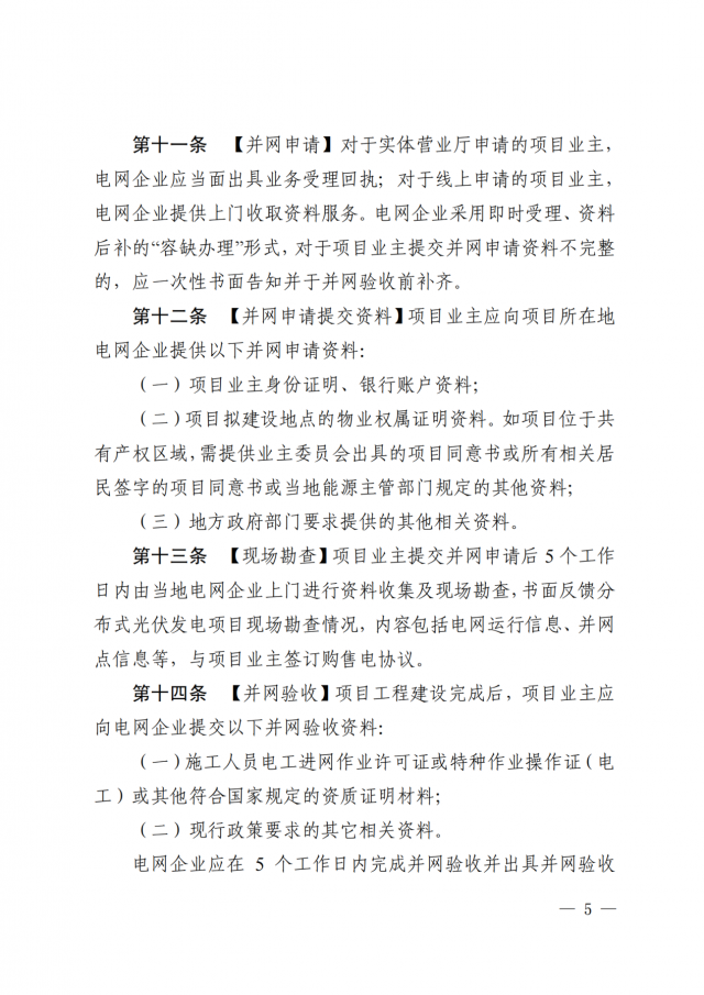 2、現(xiàn)行政策要求的其它相關資料。電網(wǎng)企業(yè)應在5個工作日內(nèi)完成并網(wǎng)驗收并出具并網(wǎng)驗收意見,并對驗收合格的項目給予安裝計量裝臵及并網(wǎng)運行。對于項目業(yè)主提交的并網(wǎng)驗收資料不完整的,電網(wǎng)企業(yè)應在2個工作日內(nèi)書面一次性告知項目業(yè)主,并在補齊資料后5個工作日內(nèi)開展并網(wǎng)驗收。