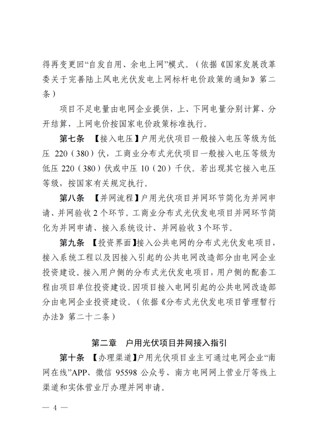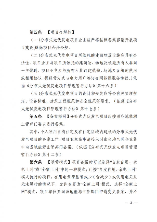 項目主要包括業(yè)主自建的戶用自然人分布式光伏項目和就地開發(fā)、就近利用且單點并網(wǎng)容量小于6兆瓦的戶用光伏以外的各類分布式光伏發(fā)電項目。文件從項目合規(guī)性、備案指引、運營模式、接入電壓、并網(wǎng)流程等方面進行了規(guī)定。本指引自印發(fā)之日起試行,有效期2年,內(nèi)容詳細,對全國其他地區(qū)具有參考意義。