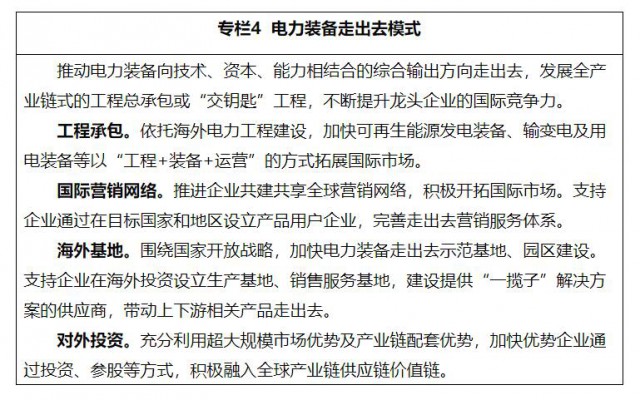 16.推動電力裝備走出去。緊緊圍繞高質(zhì)量共建“一帶一路”、深入實施《區(qū)域全面經(jīng)濟伙伴關(guān)系協(xié)定》,鼓勵優(yōu)勢電力裝備企業(yè)以多種方式加快走出去。引導(dǎo)企業(yè)取得國際認可的服務(wù)資質(zhì),帶動技術(shù)、裝備、標準和服務(wù)走出去。支持行業(yè)組織搭建走出去信息綜合服務(wù)平臺,提供法律、咨詢、風險評估等服務(wù)。