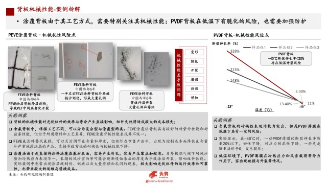 涂覆背板由于其工藝方式,需要特別關(guān)注其機(jī)械性能;PVDF背板在低溫下有脆化的風(fēng)險(xiǎn),也需要加強(qiáng)防護(hù)。
