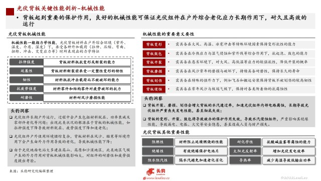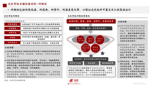 光伏組件常鋪設(shè)在氣候相對(duì)惡劣的環(huán)境下長(zhǎng)期承受顯著的老化應(yīng)力,包括來(lái)自紫外線、極端溫度、顯著溫差、冷熱應(yīng)力和高濕度等的環(huán)境應(yīng)力;光伏背板作為保護(hù)組件的最外層材料,對(duì)電池片、EVA膠膜等材料的侵蝕起到絕緣保護(hù)作用,也是長(zhǎng)期保證光伏組件的光電轉(zhuǎn)換效率的關(guān)鍵;具備高耐候性對(duì)組件長(zhǎng)期戶外服役極為重要,需耐濕熱、耐紫外、耐高低溫、耐環(huán)境腐蝕;針對(duì)光伏背板的耐候性,不同材質(zhì)背板表現(xiàn)差異較大,通常需要綜合考慮壽命、制造成本、回收、以及替換成本,以滿足應(yīng)用端的綜合需求,做到更低的度電成本。