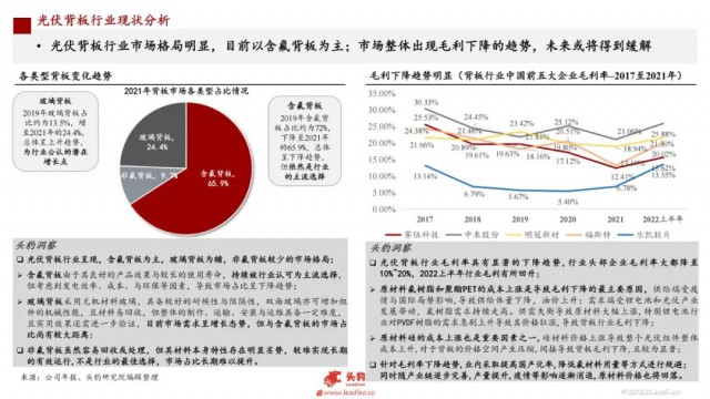 光伏背板廣泛應(yīng)用于太陽(yáng)能電池(光伏)組件,在國(guó)家政策的整體推動(dòng)下,光伏產(chǎn)業(yè)進(jìn)入爆發(fā)式增長(zhǎng)階段,同時(shí)將帶動(dòng)背板行業(yè)的快速發(fā)展與規(guī)模擴(kuò)張。目前背板行業(yè)整體呈現(xiàn),含氟背板為主,玻璃背板為輔,非氟背板較少的市場(chǎng)格局。近年光伏背板行業(yè)毛利率具有顯著的下降趨勢(shì),行業(yè)頭部5家企業(yè)最低已降至10%以下,主要由原材料成本上漲導(dǎo)致,企業(yè)積極采取應(yīng)對(duì)措施,趨勢(shì)或?qū)⒌玫骄徑狻?/p>