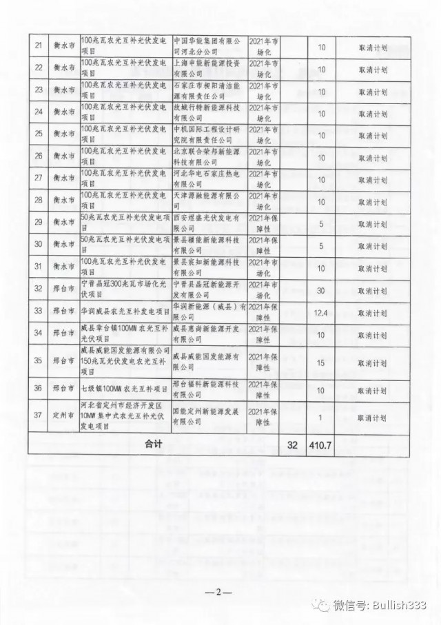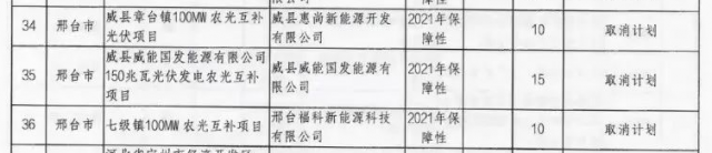 根據(jù)文件來看,相比此前發(fā)布的《風(fēng)電、光伏發(fā)電項目擬調(diào)整情況公示》來看,光伏新增取消三個2021年光伏保障性項目指標(biāo),規(guī)??傆嫗?50MW,風(fēng)電則未發(fā)生變化。需要注意的是,三個光伏項目均為農(nóng)光互補類項目,其業(yè)主分別為惠尚新能源開發(fā)、威縣威能國發(fā)能源以及中國電建。