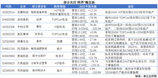 隨著“跨界潮”的愈演愈烈,A股市場(chǎng)中也有越來越多的企業(yè)有望復(fù)制上機(jī)數(shù)控、雙良節(jié)能的發(fā)展軌跡。在索比光伏網(wǎng)整理的“跨界”概念股名單中,多數(shù)企業(yè)的業(yè)績(jī)基數(shù)均較低,部分企業(yè)甚至還出現(xiàn)了一定程度的虧損。
