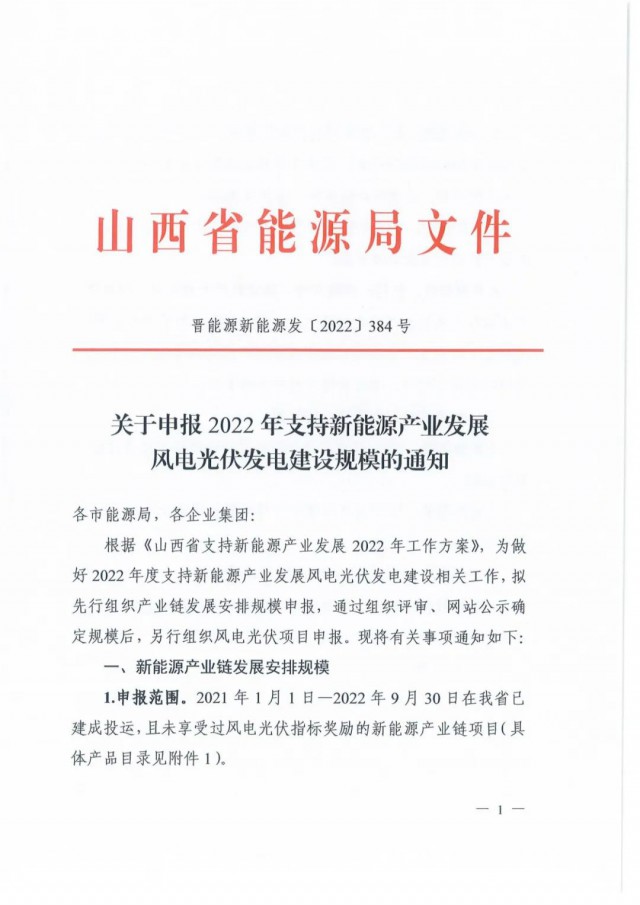 10月12日,山西省能源局印發(fā)《山西省支持新能源產(chǎn)業(yè)發(fā)展2022年工作方案》、《關(guān)于申報2022年支持新能源產(chǎn)業(yè)發(fā)展風電光伏發(fā)電建設規(guī)?!返耐ㄖ?,擬先行組織產(chǎn)業(yè)鏈發(fā)展安排規(guī)模申報3GW以及1GW煤電靈活性調(diào)峰改造配套風光項目。
