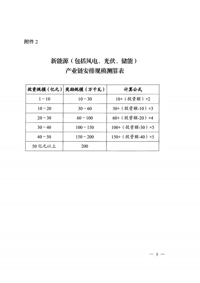 在項目規(guī)模分配規(guī)則方面則根據(jù)制造業(yè)項目的具體投資額按對應公式進行計算,例如1~10億元投資對應100~300MW項目規(guī)模,30~40億元投資對應1~1.5GW,50億元以上則統(tǒng)一為2GW項目規(guī)模。需要注意的是,不支持耗能強度高于全省平均水平的項目,若屬于補鏈項目則安排規(guī)模減半。