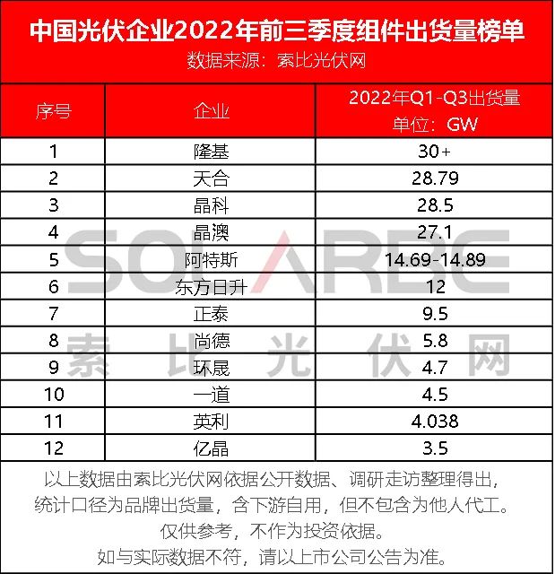 經(jīng)過索比光伏網(wǎng)多次調(diào)研走訪,結(jié)合相關(guān)企業(yè)財(cái)報(bào)、投資者活動(dòng)記錄、招投標(biāo)信息等,我們整理了中國(guó)光伏企業(yè)2022年前三季度組件出貨量榜單,詳情如下: