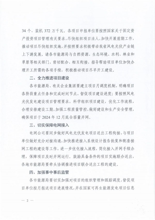 支持新能源產(chǎn)業(yè)發(fā)展項目34個,裝機372萬千瓦(3.72GW)。其中,光伏項目16個,風(fēng)光一體項目1個(含光伏6萬千瓦),涉及光伏項目共197萬千瓦(1.97GW)。要求確保項目于2024年12月底全容量并網(wǎng)。