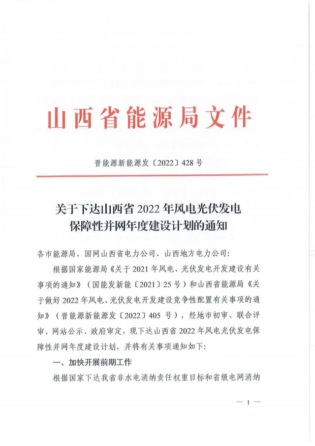 近日,山西省能源局先后印發(fā)了《關(guān)于下達山西省2022年風(fēng)電光伏發(fā)電保障性并網(wǎng)年度建設(shè)計劃的通知》(晉能源新能源發(fā)〔2022〕428號)和《關(guān)于下達山西省2022年支持新能源產(chǎn)業(yè)發(fā)展風(fēng)電光伏發(fā)電建設(shè)計劃的通知》(晉能源新能源發(fā)〔2022〕429號),共下達風(fēng)電、光伏項目132個,規(guī)模合計1418萬千瓦(14.18GW)。