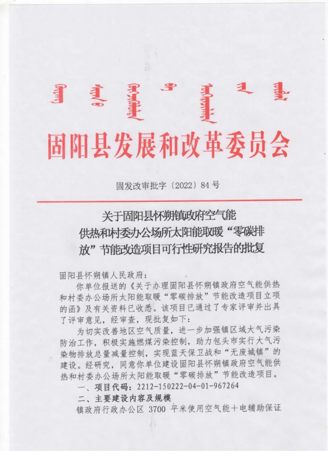 《固陽縣懷朔鎮(zhèn)政府空氣能供熱和村委辦公場所太陽能取暖"零碳排放”節(jié)能改造項目批復(fù)公示》