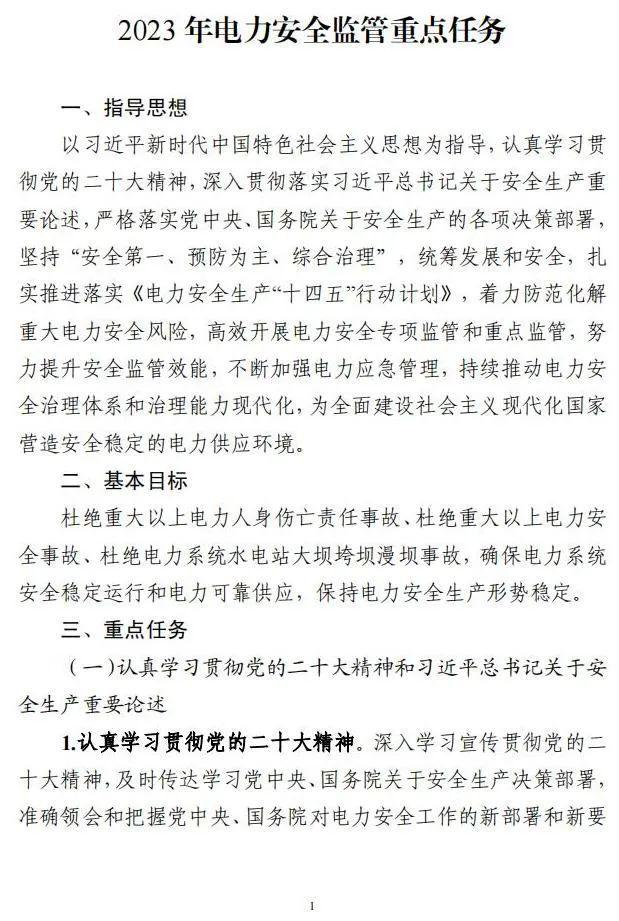 為貫徹落實黨的二十大精神,扎實做好2023年電力安全監(jiān)管工作,確保電力系統(tǒng)安全穩(wěn)定運行和電力可靠供應(yīng),推動全國電力安全生產(chǎn)形勢持續(xù)穩(wěn)定向好,我局制定了《2023年電力安全監(jiān)管重點任務(wù)》?,F(xiàn)印發(fā)給你們,請結(jié)合本地區(qū)、本單位實際,認真貫徹落實。
