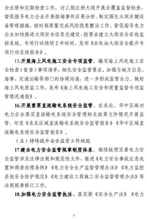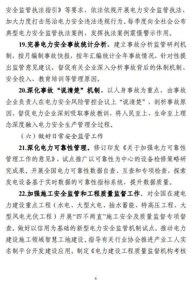 加強施工安全監(jiān)管和工程質(zhì)量監(jiān)督工作。對全國在建電力建設(shè)重點工程(水電、大型火電、抽水蓄能、特高壓工程、大型風電光伏工程)開展“四不兩直”施工安全及質(zhì)量監(jiān)督專項督查。做好以信用為基礎(chǔ)的新型電力安全監(jiān)管機制試點。