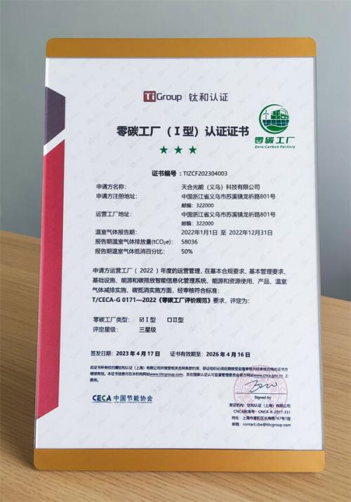 2023年4月11日~12日,零碳工廠授權(quán)評價機(jī)構(gòu)--鈦和認(rèn)證依據(jù)《零碳工廠評價規(guī)范》,從合規(guī)要求、管理要求、基礎(chǔ)設(shè)施、能源和碳排放智能信息化管理系統(tǒng)、能源和資源使用、產(chǎn)品生態(tài)設(shè)計(jì)、溫室氣體減排實(shí)施、碳抵消實(shí)施八項(xiàng)一級指標(biāo)對義烏基地進(jìn)行了詳細(xì)的評估和審核,義烏基地最終獲得了綜合評分79.68(該等級滿分為80分)的高分,自主減排后完成了對直接溫室氣體排放和輸入能源間接溫室氣體排放抵消50%,成功獲得了由鈦和認(rèn)證集團(tuán)頒發(fā)的2022年度的零碳工廠證書,成為太陽能行業(yè)首位獲第三方授權(quán)評價機(jī)構(gòu)認(rèn)證的零碳工廠企業(yè)。