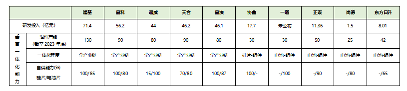 長期高強度的研發(fā)投入是科研實力長期引領的良性循環(huán)指標。據(jù)上半年中標規(guī)模TOP10企業(yè)2022年年報數(shù)據(jù)所示,企業(yè)年研發(fā)投入占營收的比例均約為5.44%,而排名TOP5的企業(yè)已與第二梯隊形成代際差。由于龍頭企業(yè)具備成本優(yōu)勢、資源優(yōu)勢和整合優(yōu)勢,相較于行業(yè)內其它企業(yè)更具競爭力。對于技術研發(fā)和擴產(chǎn)的強勢布局,是龍頭企業(yè)戰(zhàn)略性的判斷和對技術領先的自信,亦是龍頭企業(yè)未來應對產(chǎn)業(yè)爆發(fā)的交付儲備,垂直一體化自供能力達到80%的企業(yè)則具有更好的交付保障能力。