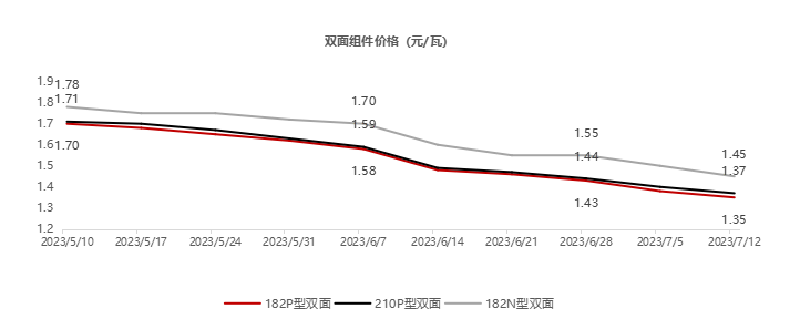2023年上半年,光伏產(chǎn)業(yè)鏈各主材環(huán)節(jié)價格均呈大幅下跌趨勢,從上游向下游(硅料-硅片-組件)的降幅依次均有遞減。據(jù)PV InfoLink數(shù)據(jù)顯示,以182雙面PERC組件價格為例,從5月初的1.7元/瓦跌至近期的1.35元/瓦。
