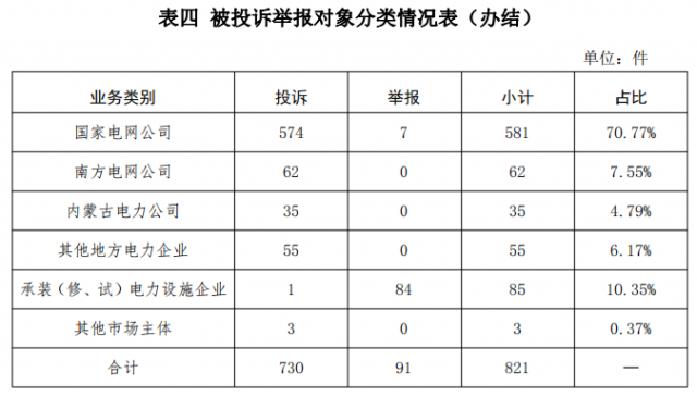 從被投訴舉報(bào)對(duì)象看,供電企業(yè)733件、占投訴舉報(bào)總數(shù)的89.28%,其中國家電網(wǎng)公司581件、占比70.77%,南方電網(wǎng)公司62件、占比7.55%,內(nèi)蒙古電力公司35件、占比3.65%,其他地方電力企業(yè)55件、占比6.17%;承裝(修、試)電力設(shè)施企業(yè)85件、占比10.35%;其他市場(chǎng)主體3件、占比0.37%。