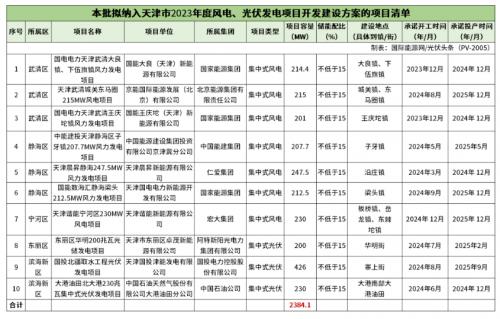 本次納入天津市2023年風(fēng)電、光伏發(fā)電項(xiàng)目共計(jì)10個(gè),規(guī)模總計(jì)2384.1MW,其中,風(fēng)電項(xiàng)目7個(gè),規(guī)模總計(jì)1528.1MW;光伏項(xiàng)目3個(gè),規(guī)模總計(jì)856MW。