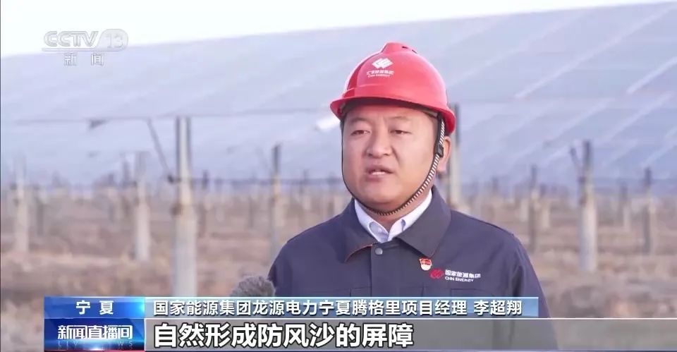 國(guó)家能源集團(tuán)龍?jiān)措娏幭尿v格里項(xiàng)目經(jīng)理 李超翔:我們通過(guò)建設(shè)光伏陣列自然形成防風(fēng)沙的屏障,并采用在地表扎草方格,實(shí)現(xiàn)防沙、固沙、治沙。在一期光伏項(xiàng)目2.8萬(wàn)畝占地面積中,治沙范圍已超過(guò)2.6萬(wàn)畝。