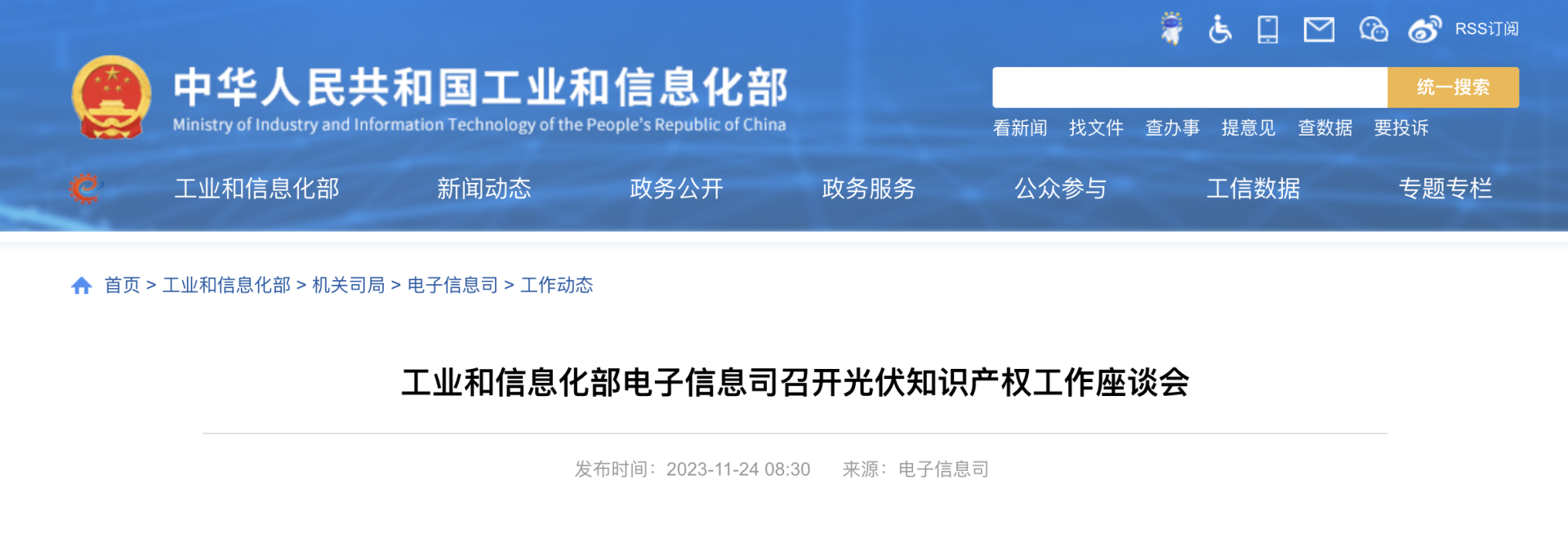 11 月 24 日,據(jù)工業(yè)和信息化部官網(wǎng)消息,近日工業(yè)和信息化部電子信息司在京召開光伏知識產(chǎn)權工作座談會,就開展光伏行業(yè)知識產(chǎn)權體系建設,加強知識產(chǎn)權保護和成果轉(zhuǎn)化,促進光伏產(chǎn)業(yè)持續(xù)創(chuàng)新發(fā)展,組織有關單位開展工作交流,并對下一步工作進行部署。光伏領域部分骨干企業(yè)、行業(yè)協(xié)會、專利機構、研究機構、律師事務所等有關負責人參加會議。