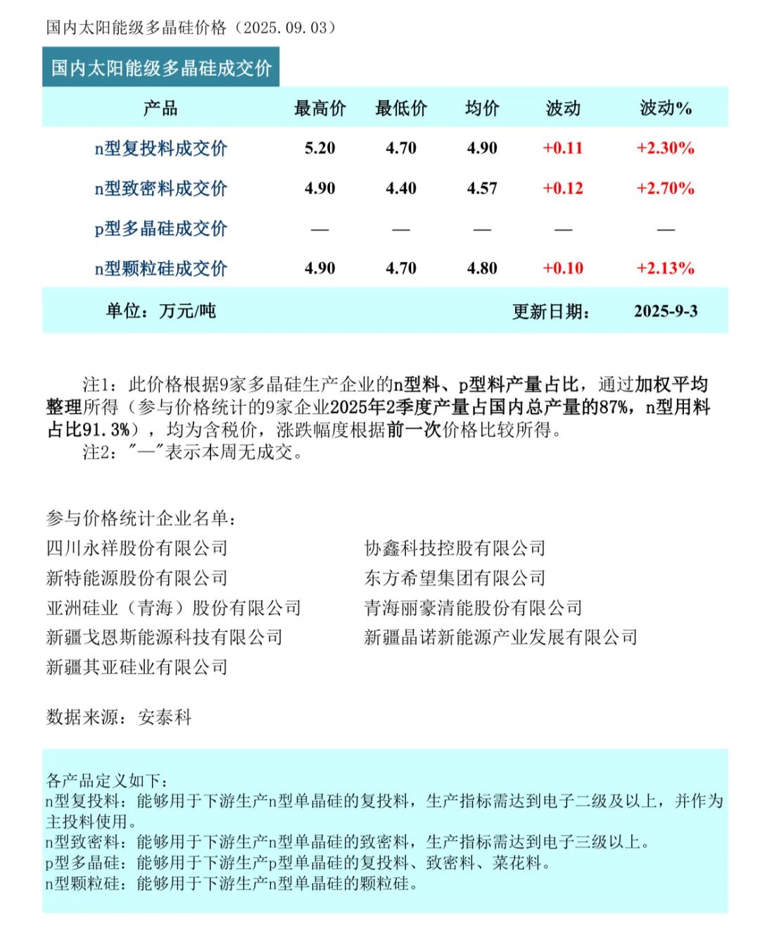 9月3日,中國有色金屬工業(yè)協(xié)會硅業(yè)分會發(fā)布本周多晶硅成交價格統(tǒng)計。n型復投料成交均價4.90萬元/噸,周環(huán)比上漲2.30%;n型致密料成交均價4.57萬元/噸,周環(huán)比上漲2.70%;n型顆粒硅成交均價4.80萬元/噸,周環(huán)比上漲2.13%。