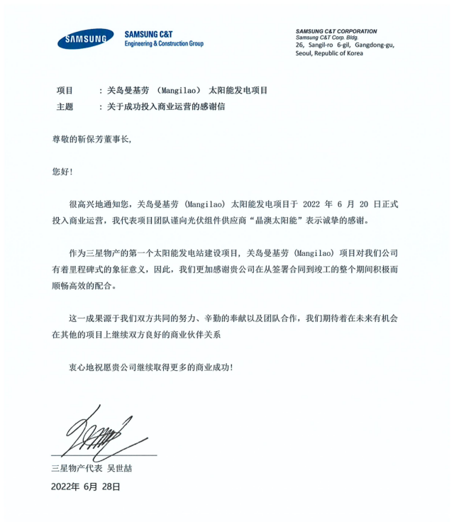 為表示對(duì)晶澳在項(xiàng)目建設(shè)過(guò)程中的大力支持以及對(duì)晶澳高品質(zhì)產(chǎn)品的贊賞和感謝,三星物產(chǎn)在項(xiàng)目建成后特寄來(lái)感謝信,以表謝意。三星物產(chǎn)在感謝信中寫道:“作為三星物產(chǎn)的第一個(gè)太陽(yáng)能發(fā)電站建設(shè)項(xiàng)目,關(guān)島曼基勞項(xiàng)目對(duì)我們公司有著里程碑式的象征意義,因此,我們更加感謝貴公司在從簽署合同到竣工的整個(gè)期間積極而順暢高效的配合?!?/p>
