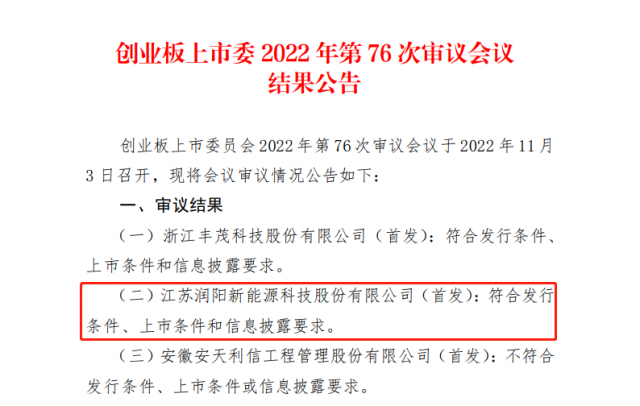 11月3日,深圳證券交易所創(chuàng)業(yè)板上市委員會(huì)發(fā)布公告稱,江蘇潤陽新能源科技股份有限公司的首次公開發(fā)行股票申請(qǐng)符合發(fā)行條件、上市條件和信息披露要求。