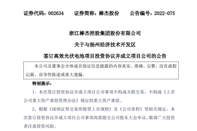 棒杰股份12月8日晚間公告,公司擬與揚州經(jīng)濟技術開發(fā)區(qū)管委會簽署項目投資協(xié)議,投資建設年產(chǎn)10GW高效光伏電池片項目,計劃總投資約26億元。朝著“無縫服裝+光伏”雙主業(yè)加速布局
