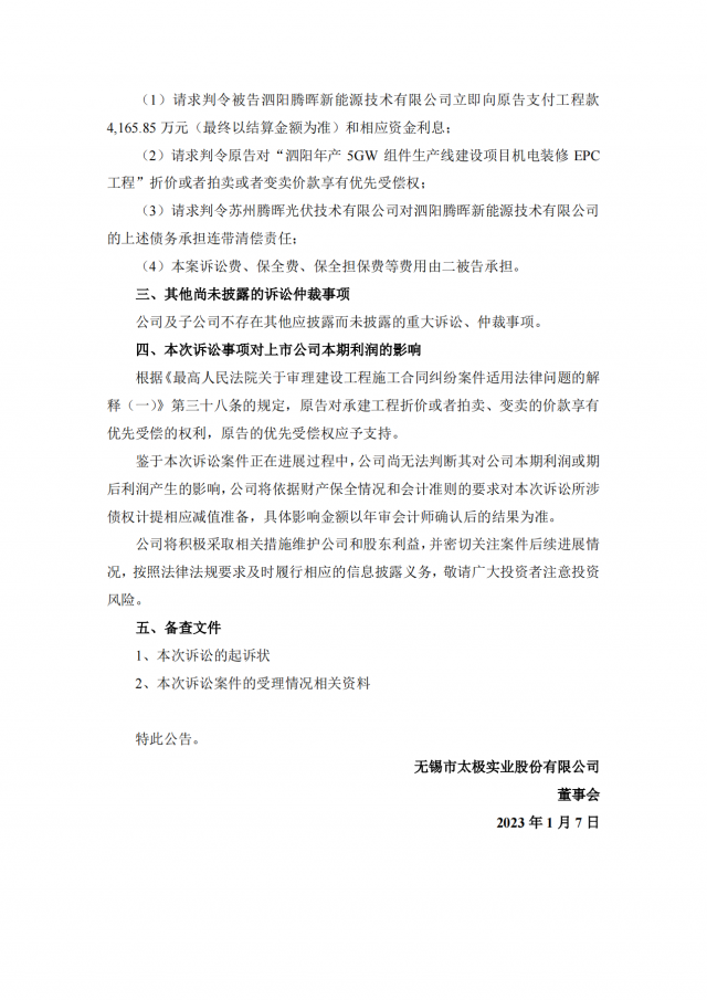 太極實(shí)業(yè)表示,鑒于本次訴訟案件正在進(jìn)展過程中,公司尚無法判斷其對(duì)公司本期利潤(rùn)或期后利潤(rùn)產(chǎn)生的影響,公司將依據(jù)財(cái)產(chǎn)保全情況和會(huì)計(jì)準(zhǔn)則的要求對(duì)本次訴訟所涉?zhèn)鶛?quán)計(jì)提相應(yīng)減值準(zhǔn)備,具體影響金額以年審會(huì)計(jì)師確認(rèn)后的結(jié)果為準(zhǔn)。值得注意還有,此前8月5日,太極實(shí)業(yè)子公司信息產(chǎn)業(yè)電子第十一設(shè)計(jì)研究院科技工程股份有限公司(以下稱十一科技)位于烏蘭察布市、鄂爾多斯市、錫林郭勒盟發(fā)展改革委的五個(gè)光伏電站項(xiàng)目,共計(jì)裝機(jī)115 MW,因擅自變更投資主體,上網(wǎng)電價(jià)批復(fù)文件被廢止,其光伏補(bǔ)貼遭核查后恐退回,太極實(shí)業(yè)也將損失超3億凈利。