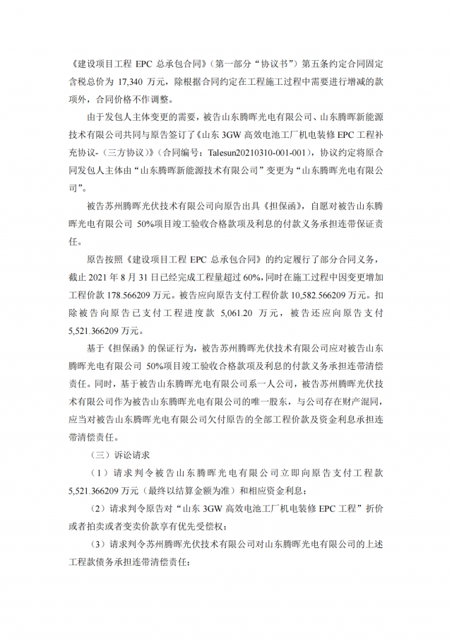 2020年~2021年期,十一科技與蘇州騰暉的六家全資子公司泗陽騰暉光電有限公司、山東騰暉新能源技術(shù)有限公司、沛縣騰暉新能源技術(shù)有限公司、宿遷騰暉新能源技術(shù)有限公司、山東騰暉光電有限公司、泗陽騰暉新能源技術(shù)有限公司簽訂了多筆項(xiàng)目施工承包合同,但上述六家企業(yè)并未全部付清工程款。