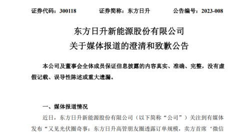 雖然朋友圈留存的時(shí)間不長,但其內(nèi)容還是被有關(guān)媒體捕捉到并迅速曝光。就此,東方日升于1月12日就相關(guān)媒體報(bào)道發(fā)布澄清和致歉公告,將涉及的有關(guān)言論的具體情況、公司儲能業(yè)務(wù)訂單情況及電池組件非硅成本情況進(jìn)行了說明。公告稱“莊英宏發(fā)布的相關(guān)言論均系其個(gè)人行為,不代表公司立場。”“莊英宏所述‘23年在手已簽4吉瓦時(shí)多了’為其與公司儲能業(yè)務(wù)相關(guān)同事交流了解后作出的個(gè)人理解,口徑為公司雙簽訂單量與意向在談?dòng)唵瘟康暮喜⒘俊?rdquo;