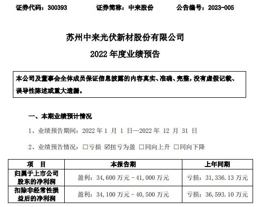 中來股份(300393)近日發(fā)布2022年年度業(yè)績(jī)預(yù)告,報(bào)告期內(nèi)歸屬于上市公司股東的凈利潤(rùn)34,600萬元–41,000萬元,較上年同期扭虧為盈。